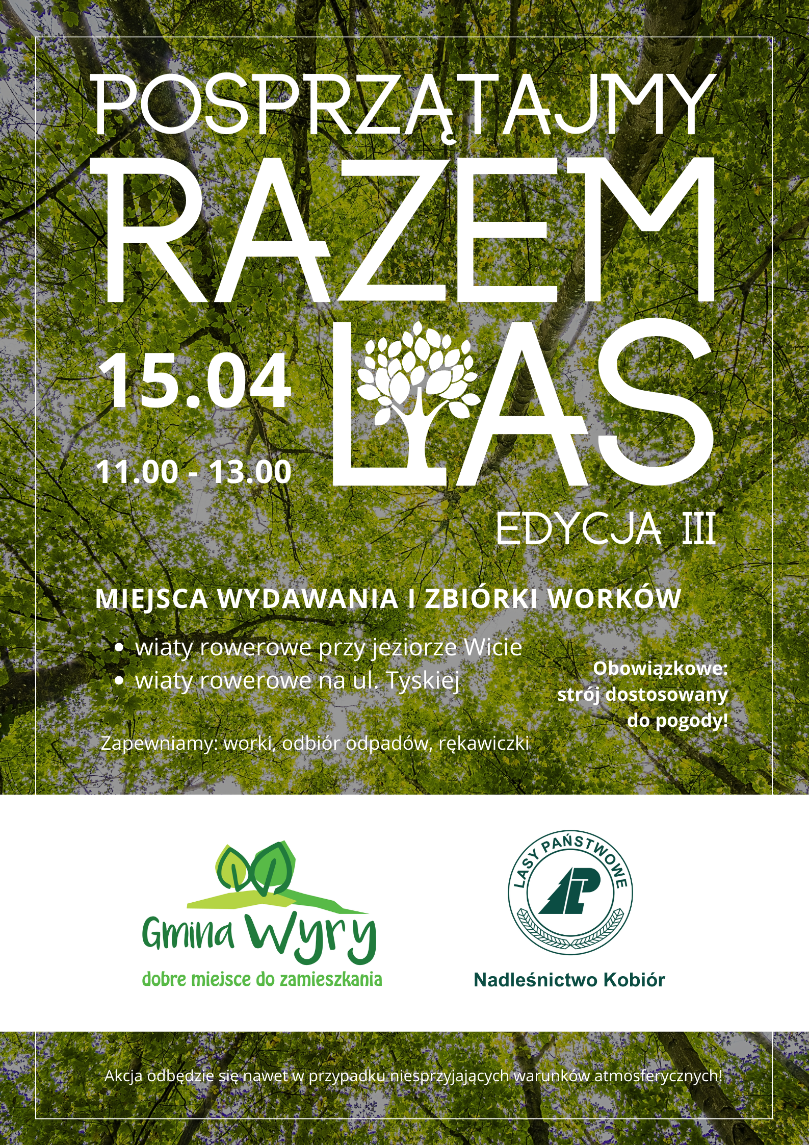 Urząd Gminy Wyry we współpracy z Nadleśnictwem Kobiór już w najbliższą sobotę, 15 kwietnia organizuje trzecią edycję akcji „Posprzątajmy razem las”. Zachęcamy do udziału wszystkich, którym czystość naszych lasów leży na sercu.