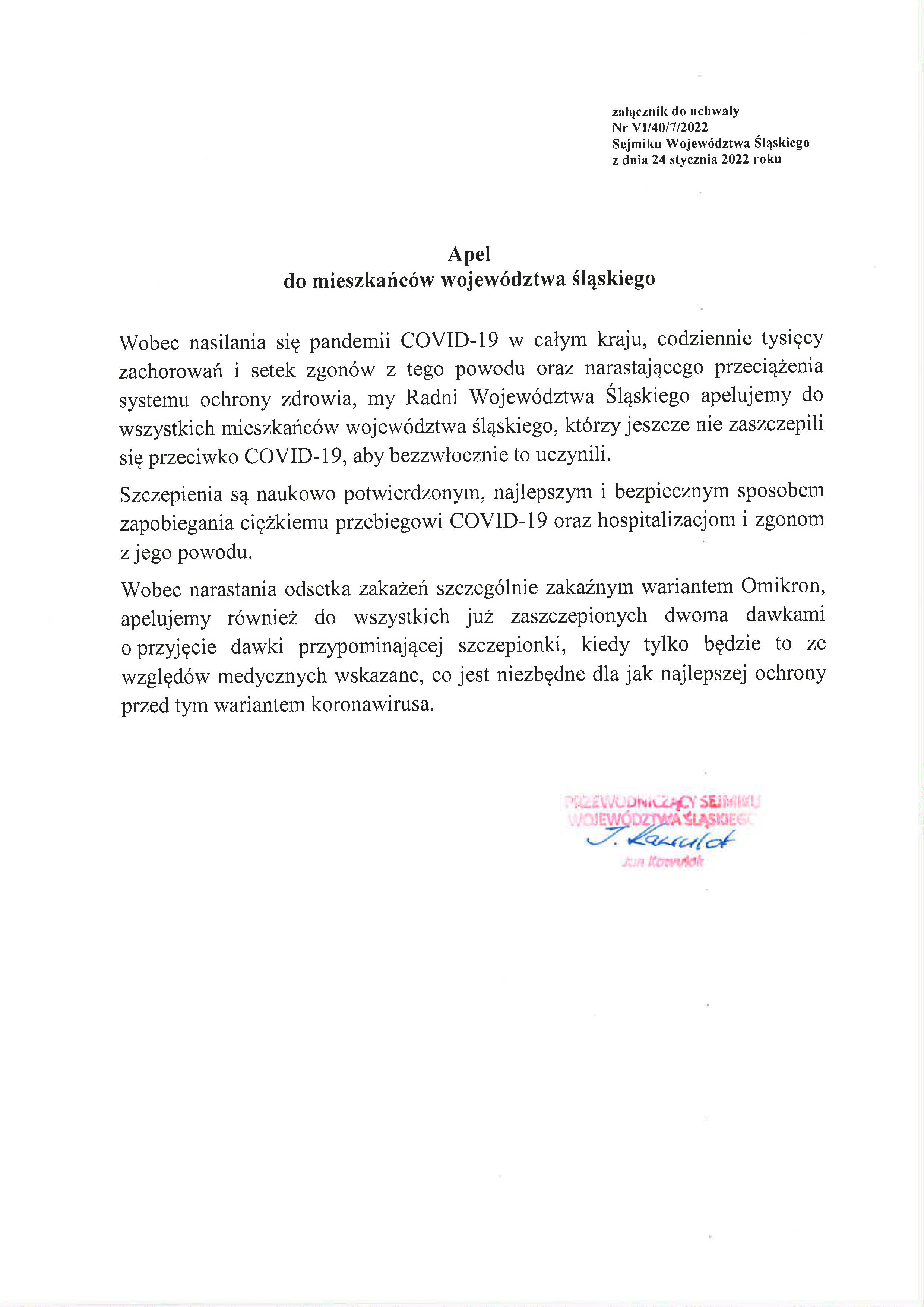 Wobec nasilania się pandemii COVID-19 w całym kraju, codziennie tysięcy zachorowań i setek zgonów z tego powodu oraz narastającego przeciążenia systemu ochrony zdrowia, my Radni Województwa Śląskiego apelujemy do wszystkich mieszkańców województwa śląskiego, którzy jeszcze nie zaszczepili się przeciwko COVID-19, aby bezzwłocznie to uczynili.