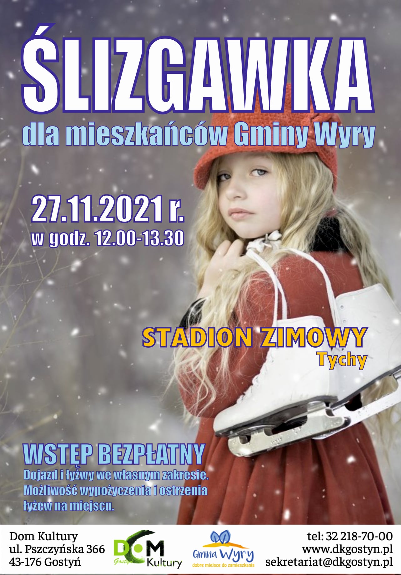 Dom Kultury w Gostyni już jutro (27.11) w godz. 12.00 - 13.30 zaprasza wszystkich mieszkańców Gminy Wyry na darmową ślizgawkę na Stadionie Zimowym w Tychach.