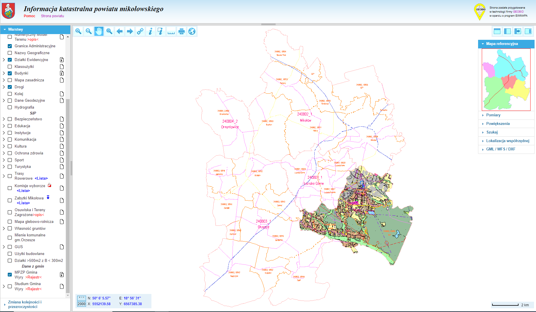 Aby zapoznać się z mapami należy wejść na stronę: GEOPORTAL 2 (mikolowski.pl) i wybrać opcję „mapa w trybie publicznym”, a następnie w menu bocznym, po lewej stronie ekranu, zaznaczyć odpowiednią opcję w zakładce „dane z gmin”.