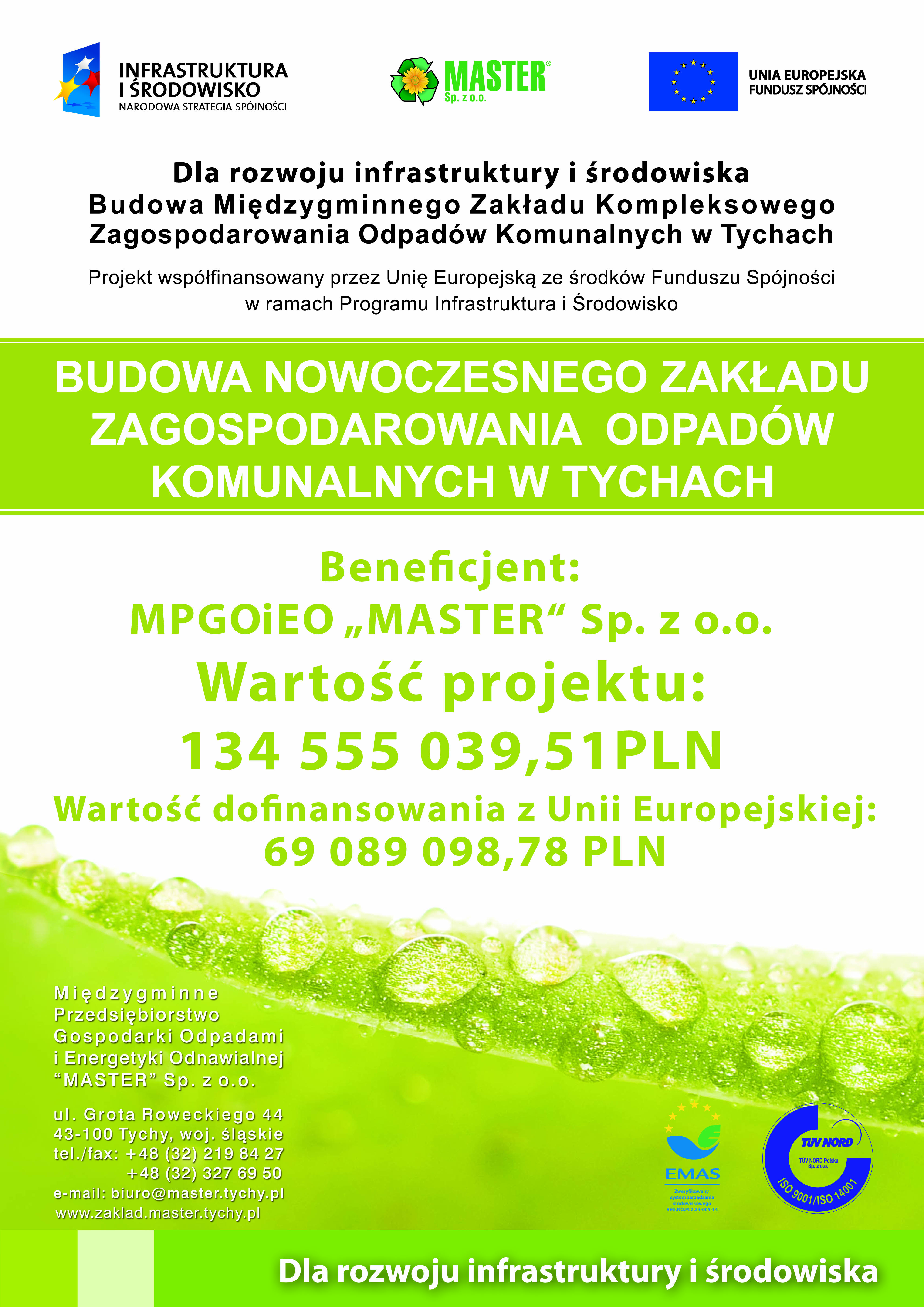 Budowa Międzygminnego Zakładu Kompleksowego Zagospodarowania Odpadów Komunalnych w Tychach kosztowała prawie 134 mln zł, z czego ponad 69 mln zł to dotacja unijna, a 23 mln zł - pożyczka preferencyjna z Narodowego Funduszu Ochrony Środowiska i Gospodarki Wodnej. Zainwestowane środki własne gmin – udziałowców w spółce MASTER wyniosły 17,7 mln zł.
