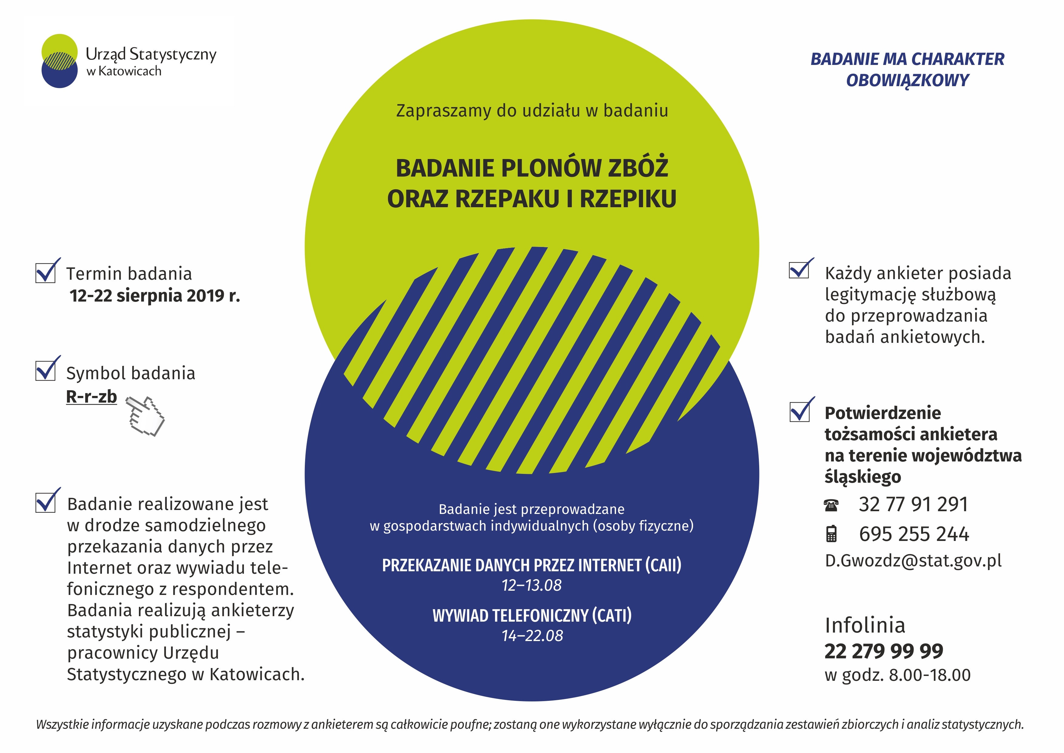 W ramach stałego informowania o realizacji na terenie województwa śląskiego badań ankietowych, prowadzonych przez ankieterów – pracowników Urzędu Statystycznego w Katowicach - Urząd Statystyczny przekazuje informację o badaniu ankietowym R-r-zb (Badanie plonów zbóż oraz rzepaku i rzepiku), które zostanie przeprowadzone w dniach 12 – 22 sierpnia 2019 r.