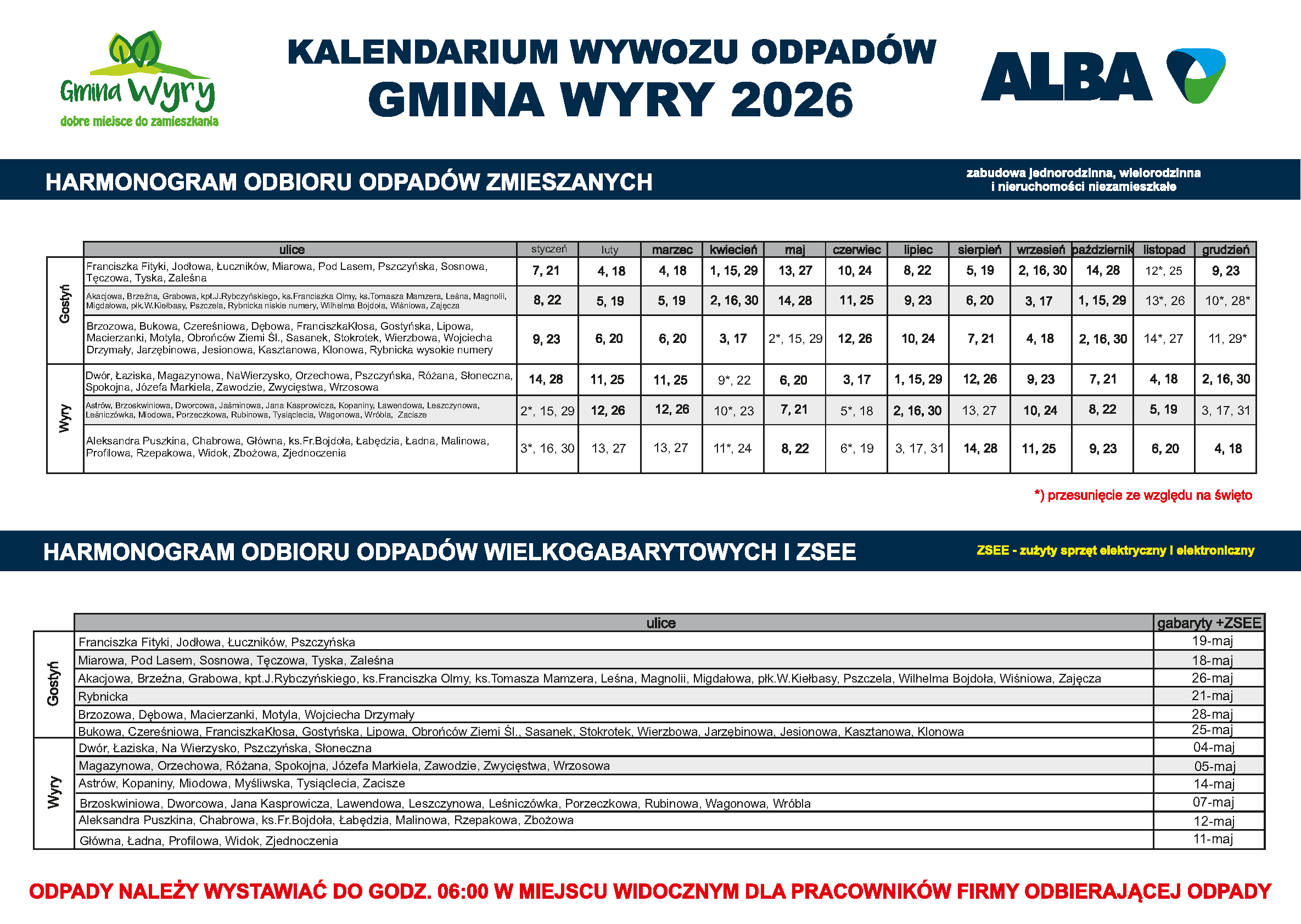 Publikujemy nowy harmonogram zbiórki odpadów komunalnych z terenu Gminy Wyry. Jest on już również dostępny w aplikacji EcoHarmonogram. Prosimy o pobranie aktualizacji. Harmonogram odbioru odpadów 2026.pdf powrót