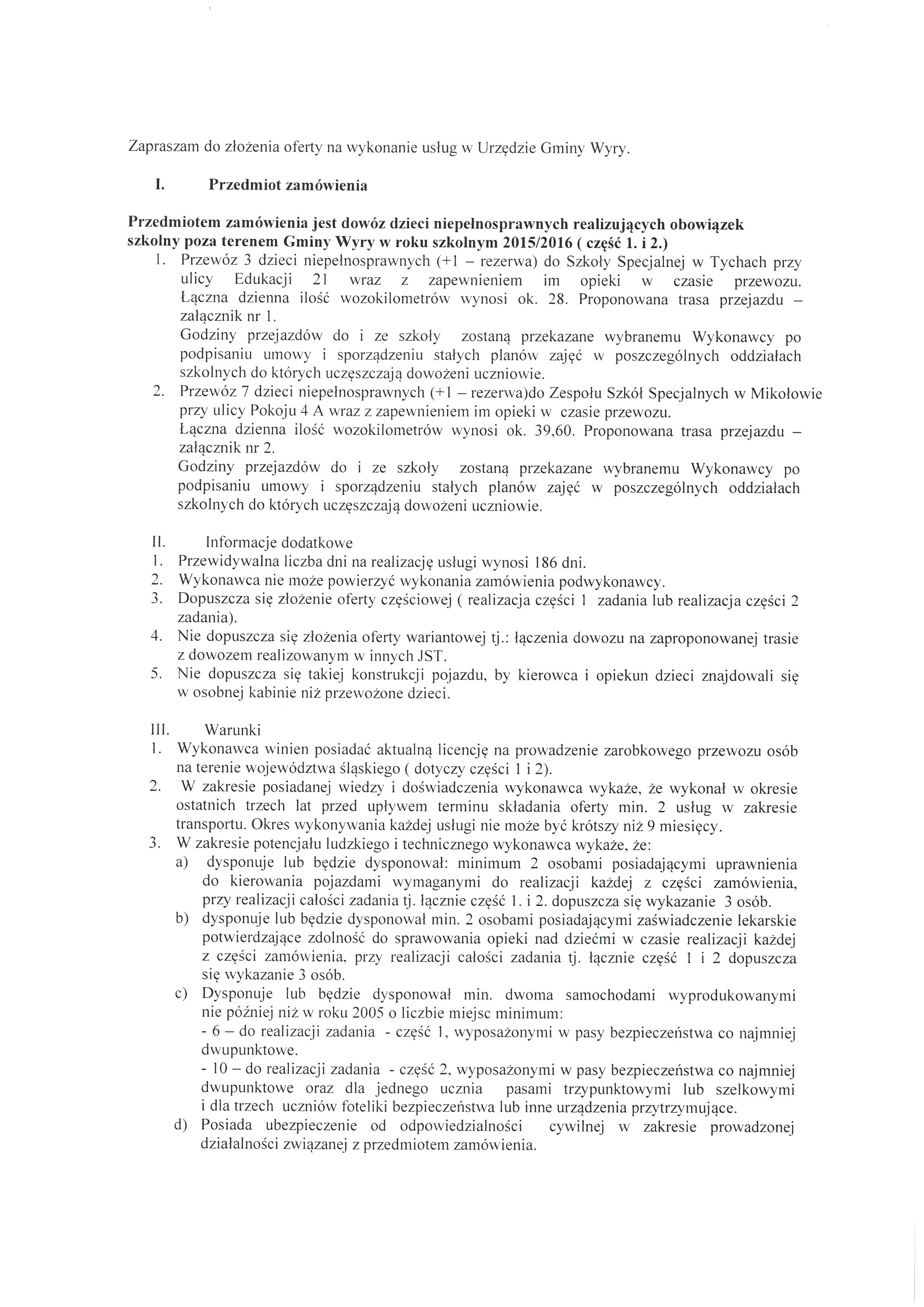 Rozpoczęto organizację zbiorowego dowozu w roku szkolnym 2015/2016 dzieci niepełnosprawnych do szkół poza terenem Gminy Wyry w których realizują obowiązek szkolny. Pliki do pobrania: 1) Zapytanie ofertowe do pobrania w wersji word oraz pdf. 2) Załączniki do pobrania w wersji word oraz pdf. 3) Projekty umów do pobrania tutaj i tutaj.