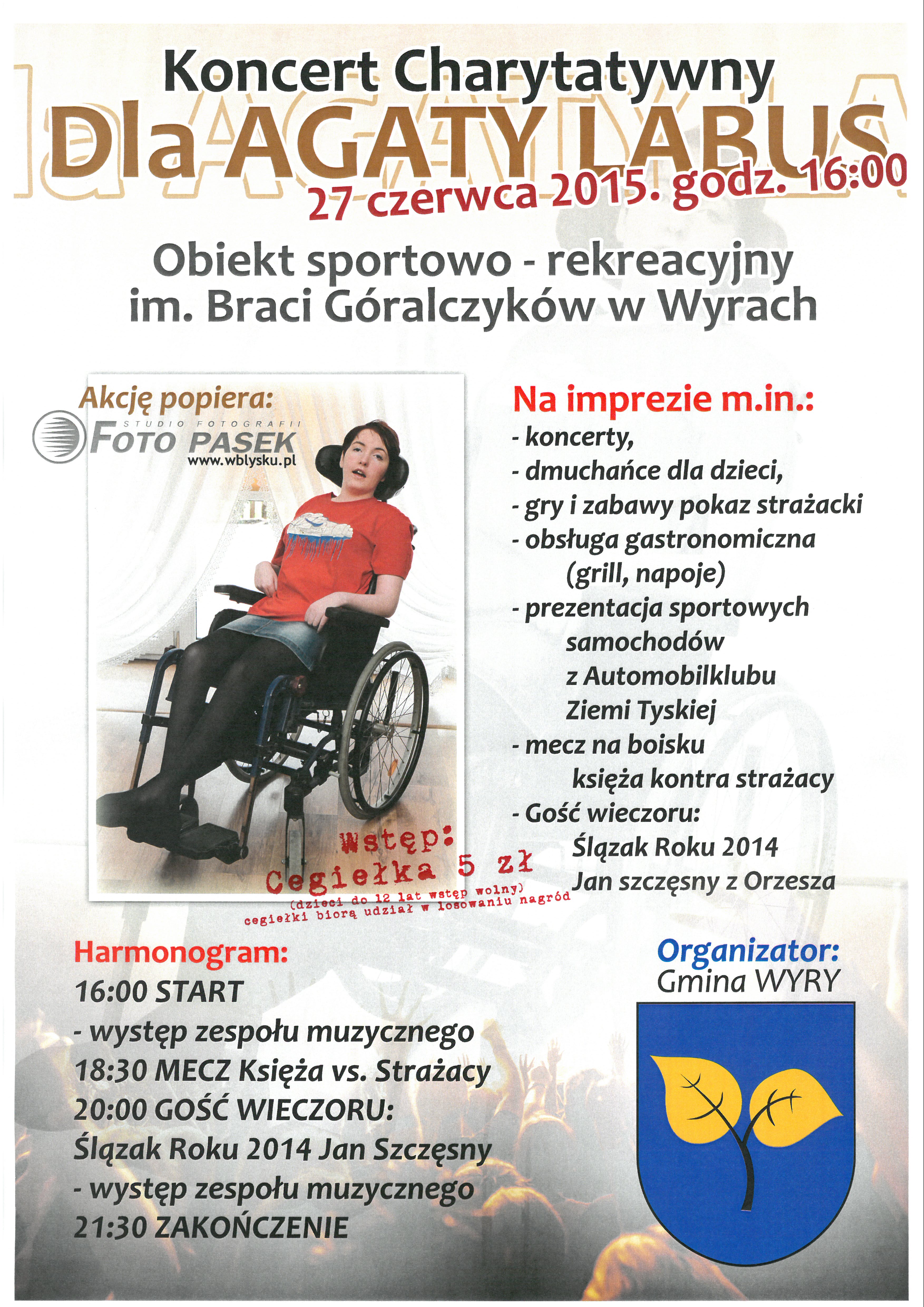 27 czerwca 2015 roku na Obiekcie sportowo- rekreacyjnym im. Braci Góralczyków w Wyrach odbędzie się Koncert charytatywny dla Agaty Labus.