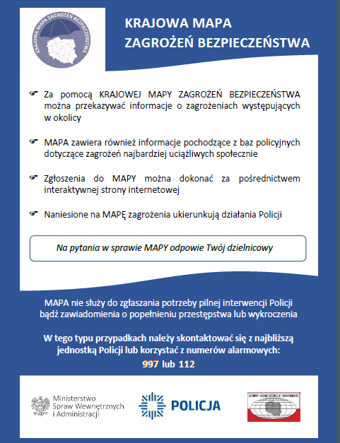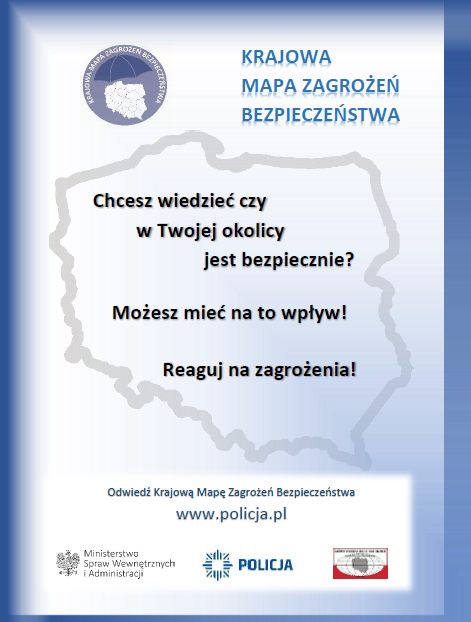 Krajowa Mapa Zagrożeń Bezpieczeństwa to interaktywna mapa, która pozwala przekazywać Policji informacje o niebezpiecznych miejscach w okolicy.