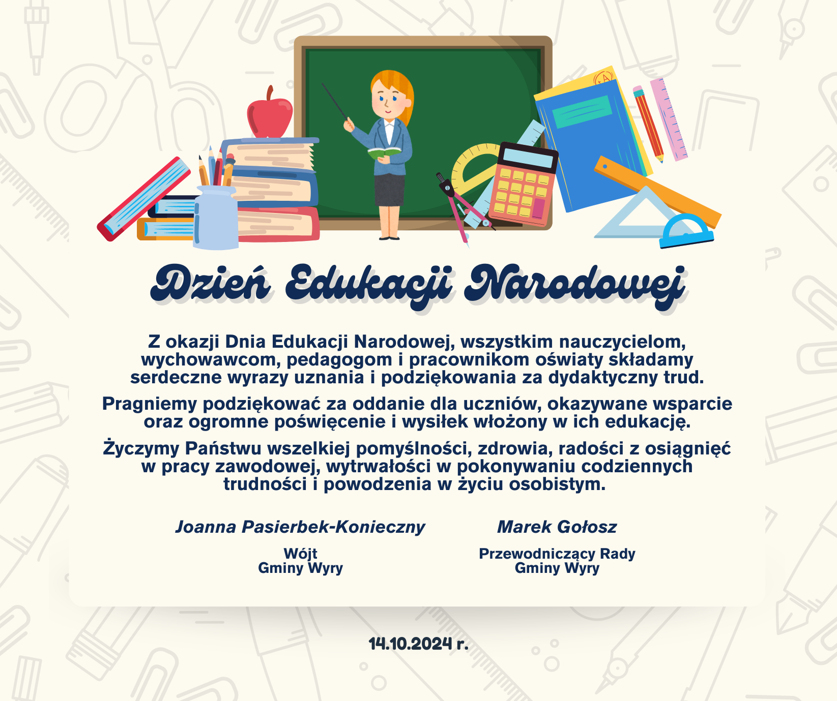 Z okazji Dnia Edukacji Narodowej, wszystkim nauczycielom, wychowawcom, pedagogom i pracownikom oświaty składamy serdeczne wyrazy uznania i podziękowania za dydaktyczny trud. Pragniemy podziękować za oddanie dla uczniów, okazywane wsparcie oraz ogromne poświęcenie i wysiłek włożony w ich edukację. Życzymy Państwu wszelkiej pomyślności, zdrowia, radości z osiągnięć w pracy zawodowej, wytrwałości w pokonywaniu codziennych trudności i powodzenia w życiu osobistym.