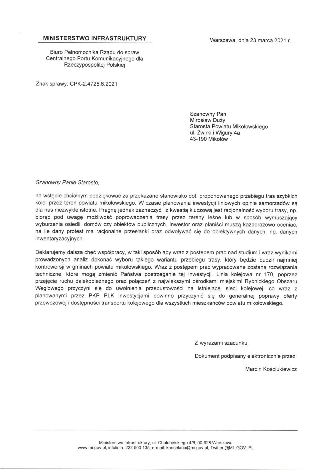Przypomnijmy, że do Ministerstwa Infrastruktury oraz Centralnego Portu Komunikacyjnego Sp. z o.o. zostało wysłane wspólne stanowisko zarządu powiatu oraz władz gmin powiatu mikołowskiego odnośnie do proponowanego przebiegu tras szybkich kolei w ramach CPK przez teren naszego powiatu. Wczoraj, 23 marca od Dyrektora Biura Pełnomocnika Rządu do spraw Centralnego Portu Komunikacyjnego do Starostwa Powiatowego w Mikołowie wpłynęło pismo z odpowiedzią w tej sprawie. Jego treść poniżej: