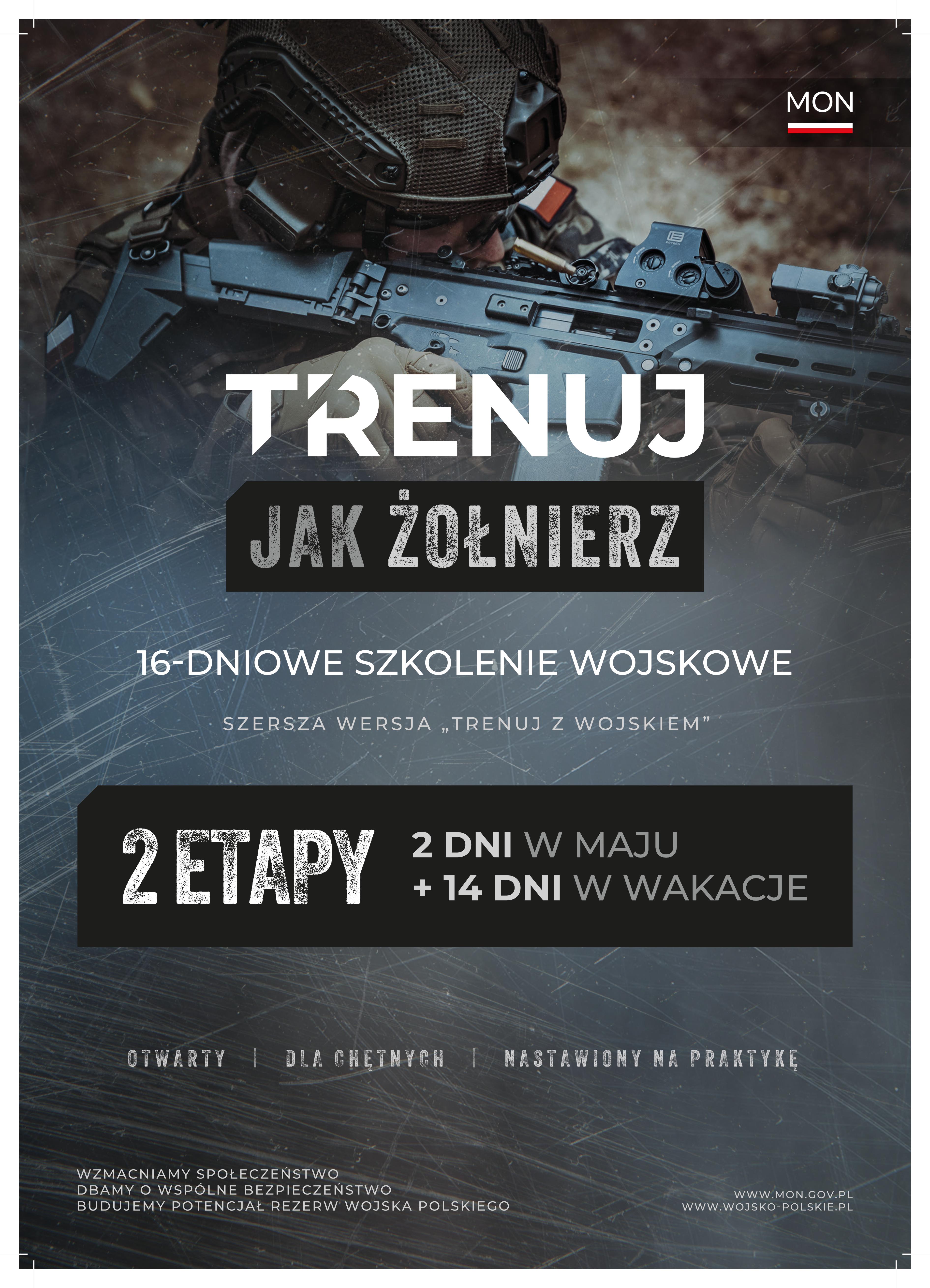 „Trenuj jak żołnierz” to propozycja dla każdego, kto ukończył 18 lat i ma obywatelstwo polskie. Projekt umożliwia ochotnikom 16-dniowe szkolenie wojskowe w dwóch etapach: 2-dniowe poznanie jednostki i wojska (6-7 i 13-14 maja) oraz 14-dniowe szkolenie (między 16-29 lipca i 6-19 sierpnia).
