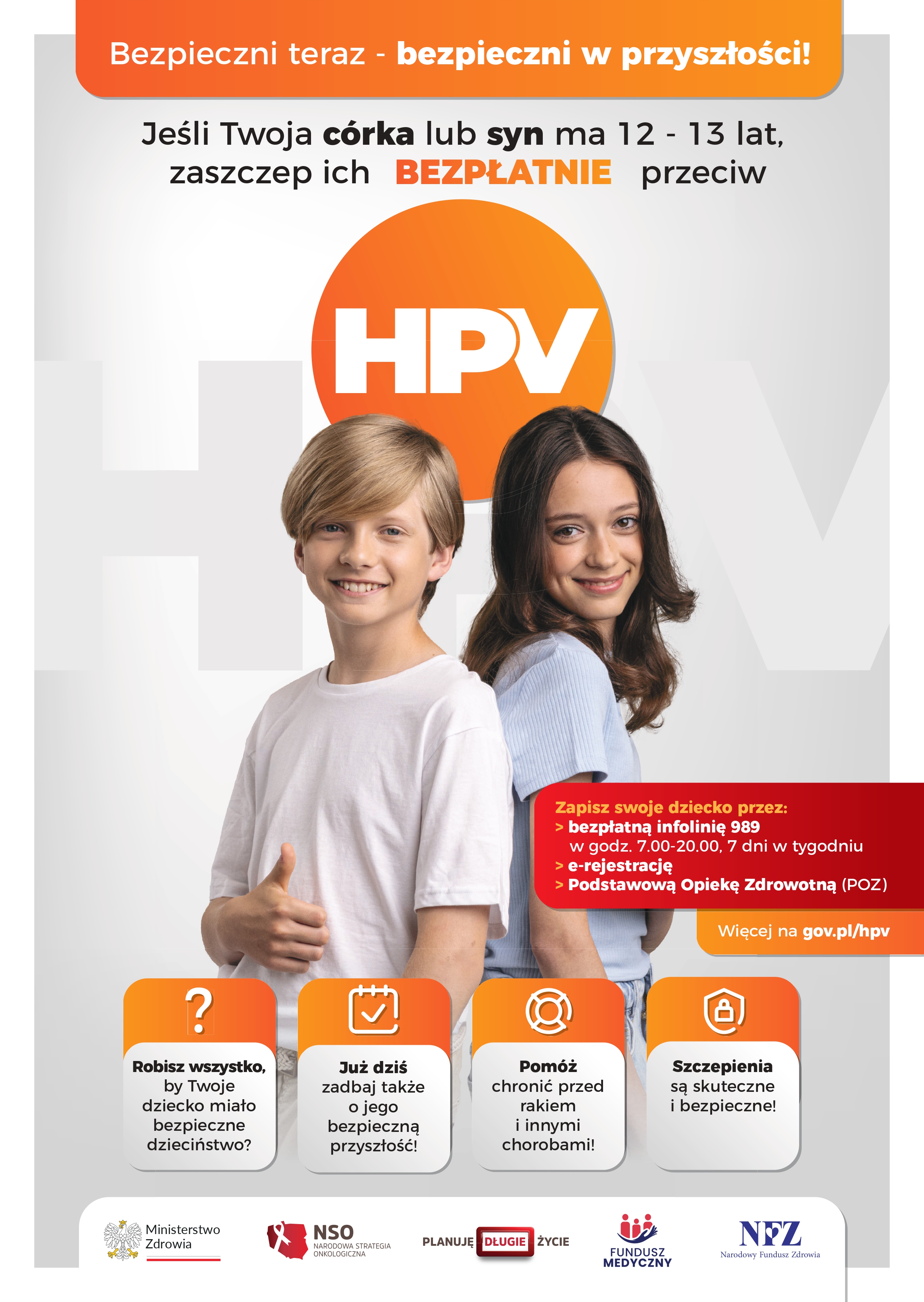 Zapisując dziecko na szczepienie można wybrać jedną z dwóch dostępnych szczepionek (2-walentną Cervarix lub 9-walentną Gardasil9). Szczepionka chroni przed zakażeniem HPV, czyli ludzkim wirusem brodawczaka, przenoszonego głównie drogą płciową. Zakażenia HPV dotyczą obu płci. HPV odpowiada za wszystkie zachorowania na raka szyjki macicy oraz inne typy nowotworów u kobiet i mężczyzn.