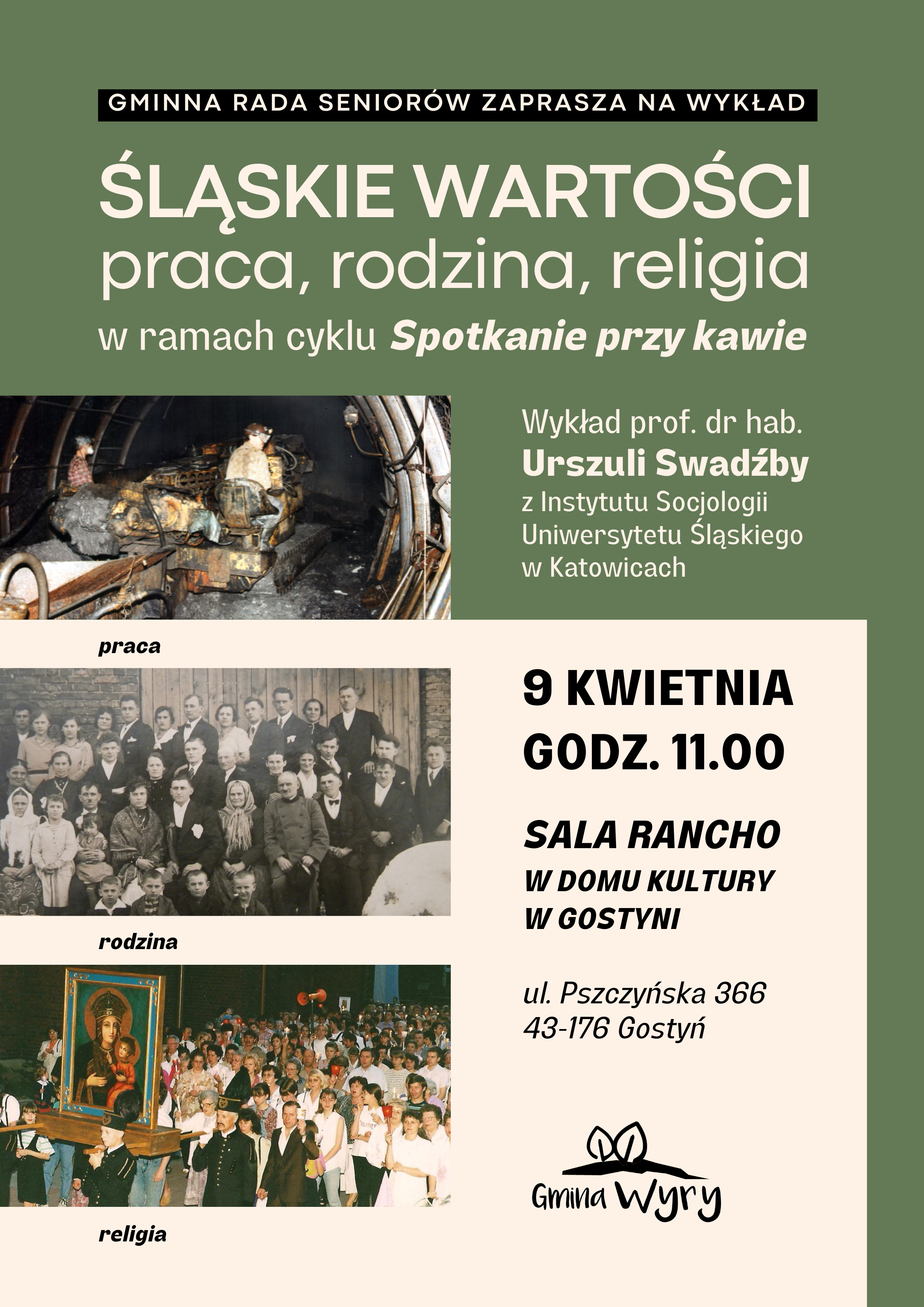 Gminna Rada Seniorów, 9 kwietnia na godz. 11.00 zaprasza na wykład prof. dr hab. Urszuli Swadźby z Instytutu Socjologii Uniwersytetu Śląskiego w Katowicach pn. Śląskie wartości – praca, rodzina, religia.