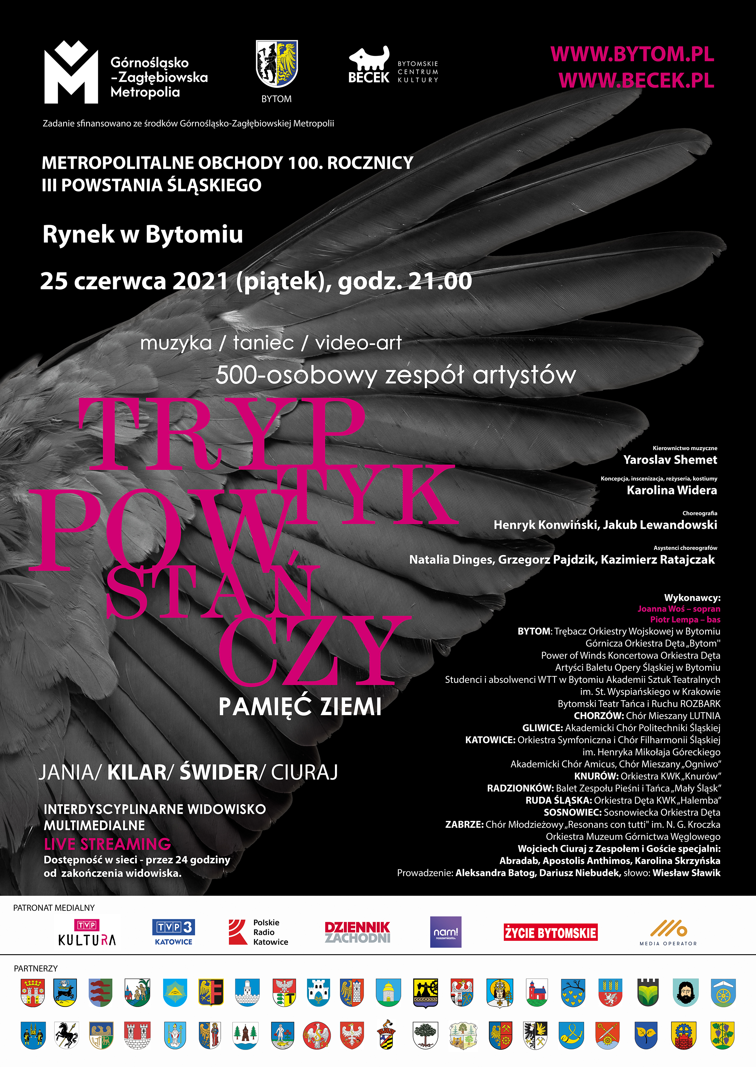 25 czerwca, o godz. 21.00, na bytomskim Rynku odbędzie się interdyscyplinarne widowisko multimedialne, z udziałem 500-osobowego zespołu artystów Górnośląsko-Zagłębiowskiej Metropolii „TRYPTYK POWSTAŃCZY – PAMIĘĆ ZIEMI”.