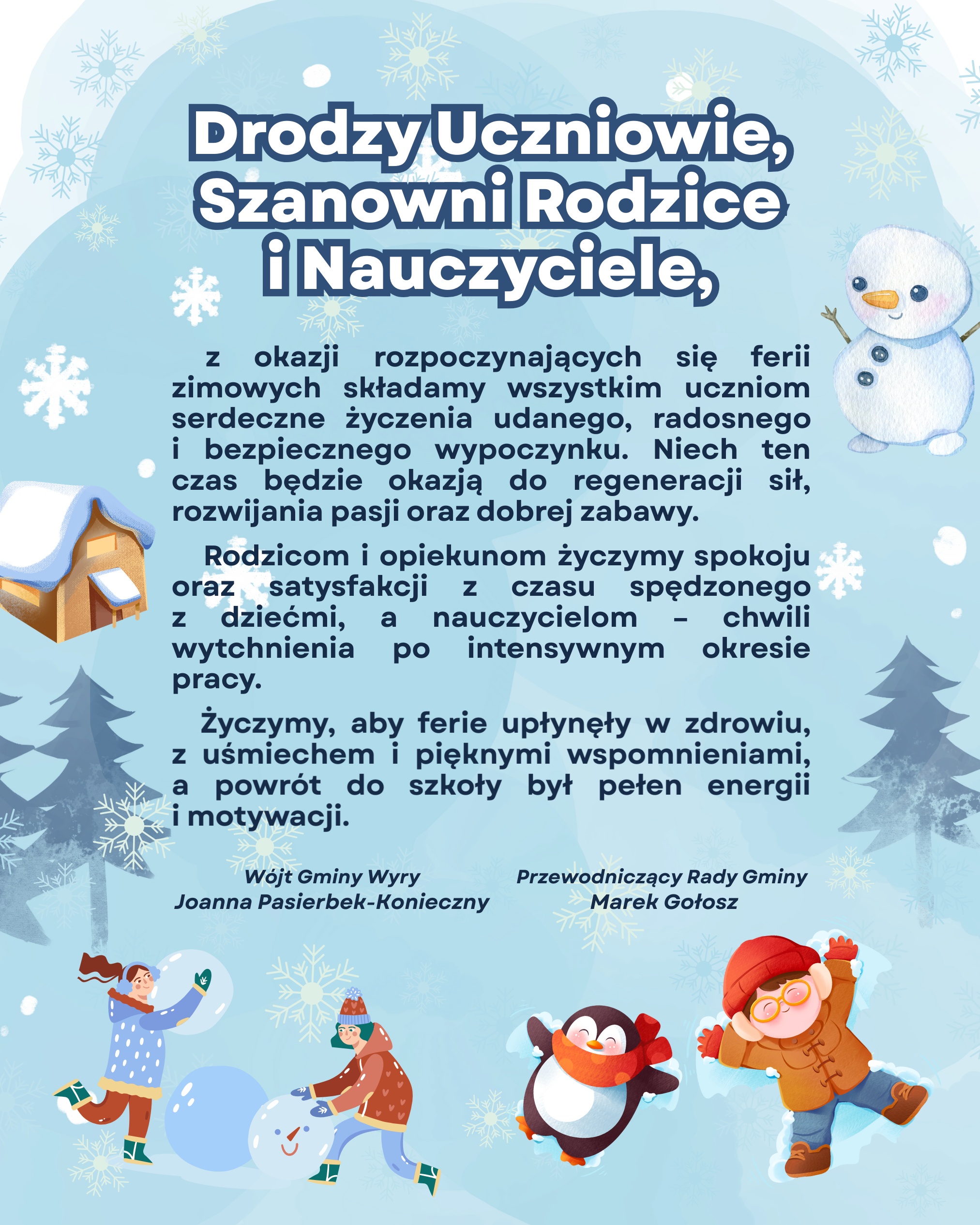 z okazji rozpoczynających się ferii zimowych składamy wszystkim uczniom serdeczne życzenia udanego, radosnegoi bezpiecznego wypoczynku. Niech ten czas będzie okazją do regeneracji sił, rozwijania pasji oraz dobrej zabawy.