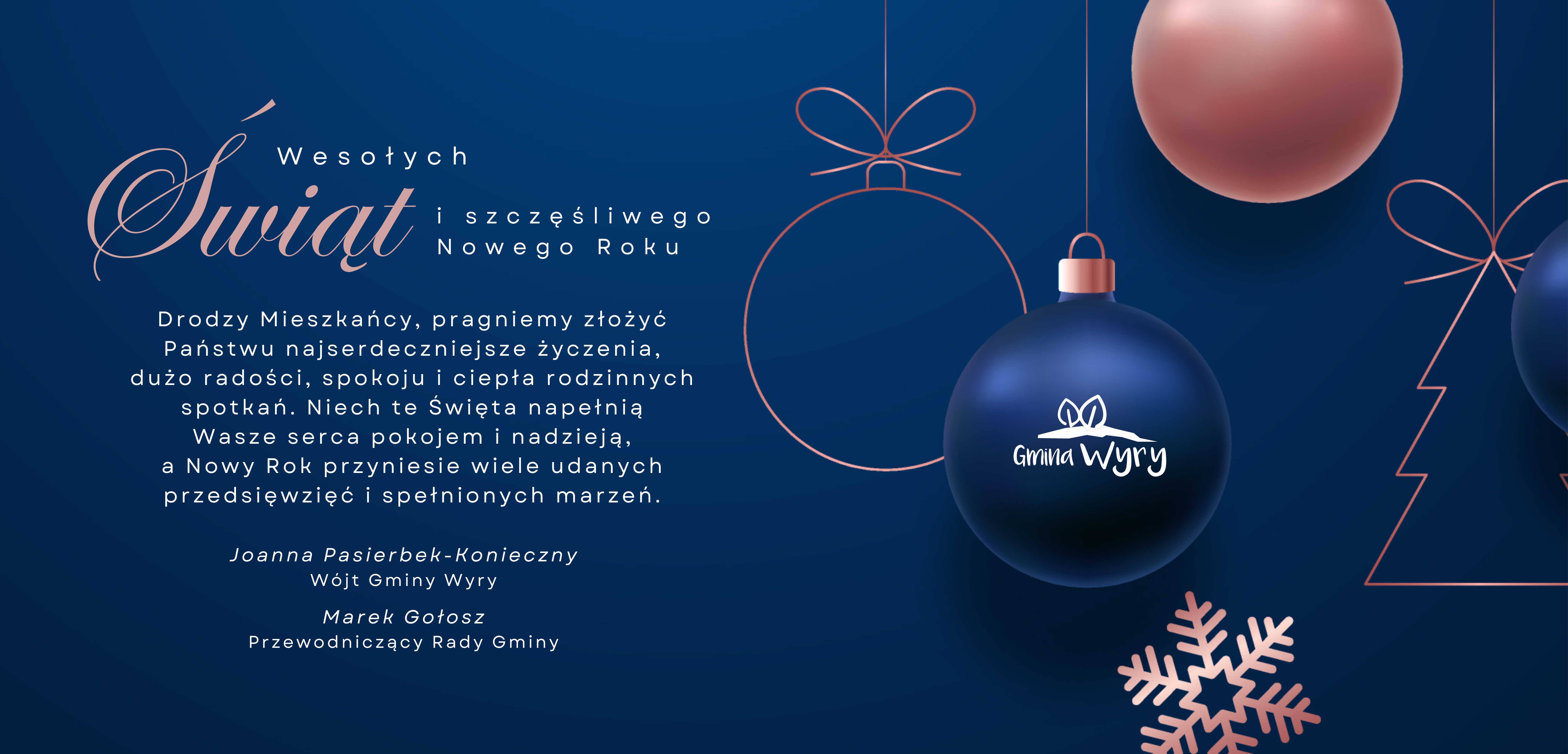 Drodzy Mieszkańcy, pragniemy złożyć Państwu najserdeczniejsze życzenia, dużo radości, spokoju i ciepła rodzinnych spotkań. Niech te Święta napełnią Wasze serca pokojem i nadzieją, a Nowy Rok przyniesie wiele udanych przedsięwzięć i spełnionych marzeń.