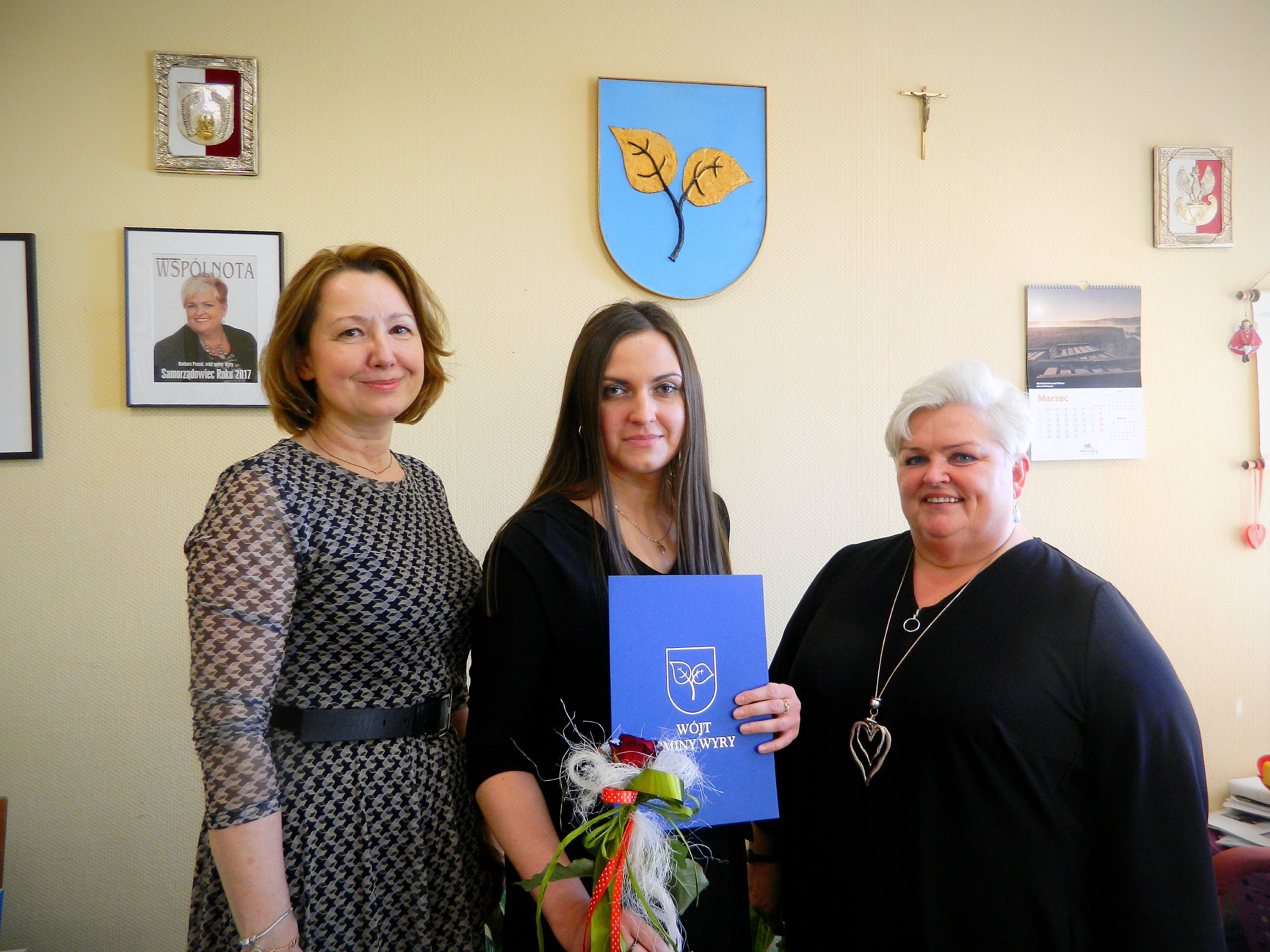 Patrycja Skotniczny – nauczyciel języka polskiego w Szkole Podstawowej w Wyrach, 22 marca w Urzędzie Gminy Wyry odebrała z rąk wójt Barbary Prasoł akt nadania stopnia awansu zawodowego nauczyciela mianowanego.