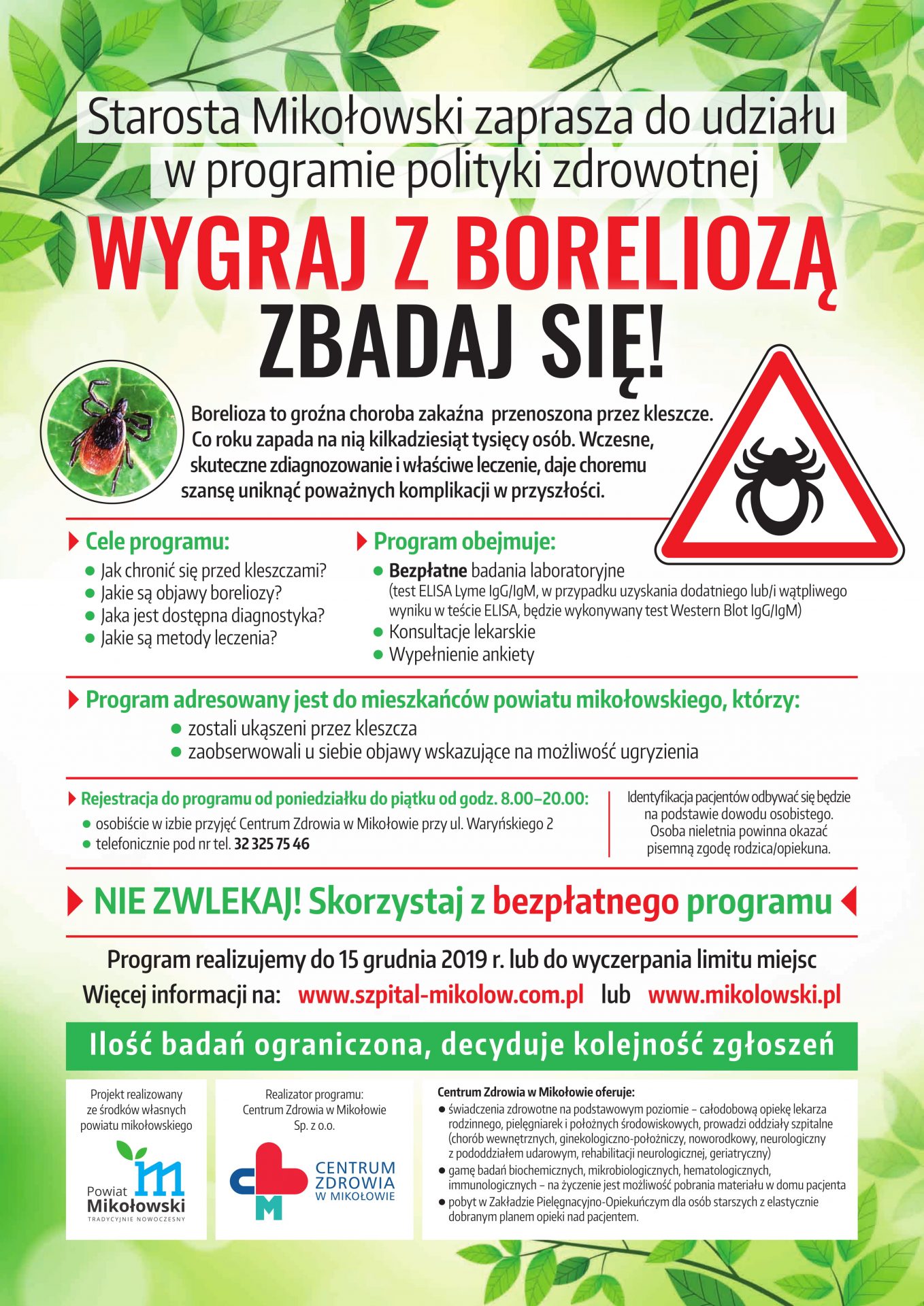 Rusza bezpłatny program zdrowotny „Wygraj z boreliozą – zbadaj się”. Jest on skierowany do mieszkańców Powiatu Mikołowskiego i finansowany z budżetu powiatu. Realizatorem jest Centrum Zdrowia w Mikołowie.
