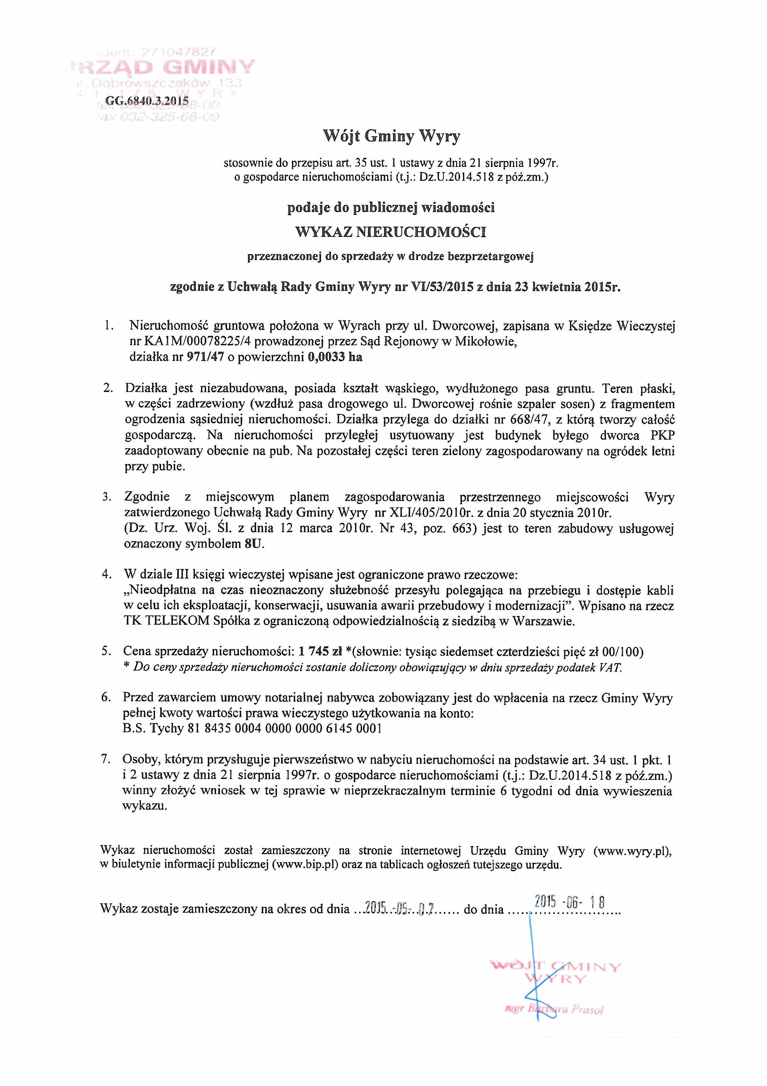 • Nieruchomość gruntowa położona w Wyrach przy ul. Głównej
