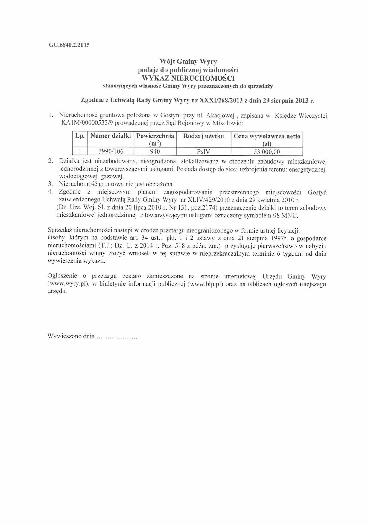 Nieruchomość gruntowa położona w Wyrach przy ul. Głównej