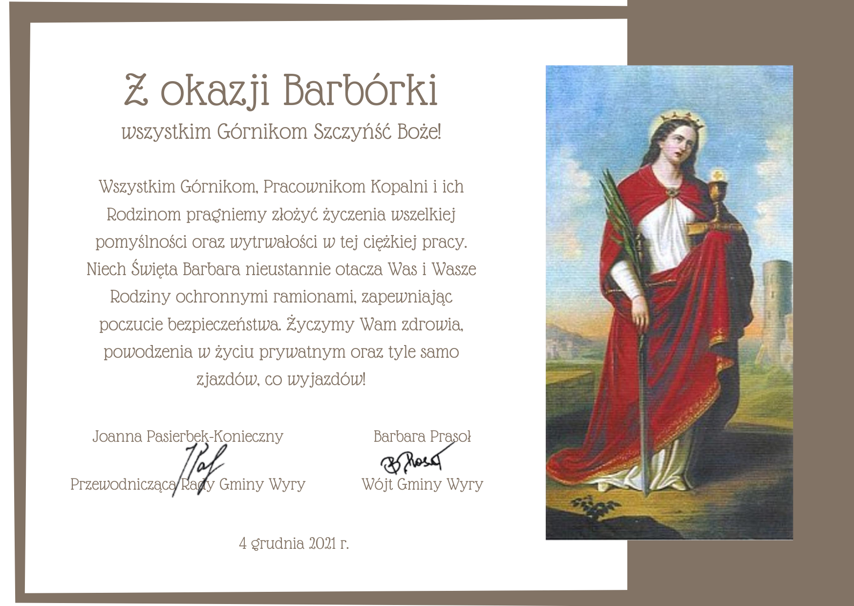 Wszystkim Górnikom, Pracownikom Kopalni i ich Rodzinom pragniemy złożyć życzenia wszelkiej pomyślności oraz wytrwałości w tej ciężkiej pracy. Niech Święta Barbara nieustannie otacza Was i Wasze Rodziny ochronnymi ramionami, zapewniając poczucie bezpieczeństwa. Życzymy Wam zdrowia, powodzenia w życiu prywatnym oraz tyle samo zjazdów, co wyjazdów!