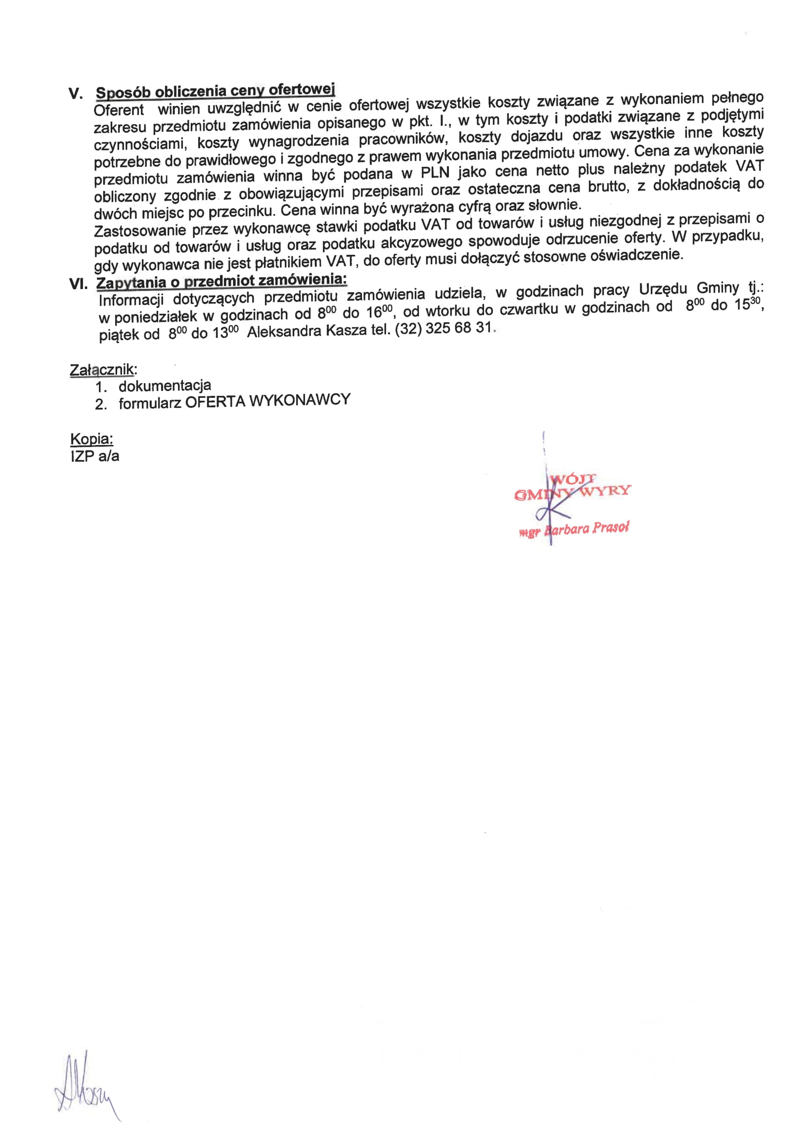 Na podstawie art. 2.1 pkt. 1 ustawy z dnia 11 września 2019r. Prawo zamówień publicznych (Dz. U. z 2021 poz. 2054) Zamawiający - Gmina Wyry zaprasza do złożenia oferty cenowej na wykonanie usługi: Pełnienie funkcji inspektora nadzoru inwestorskiego wraz z kontrolowaniem rozliczeń budowy i sprawdzeniem dokumentacji projektowej, dla inwestycji pn.: Zaprojektowanie i wykonanie termomodernizacji budynku mieszkalnego w Gostyni przy ul. Pszczyńskiej 339 w ramach zadania „Termomodernizacja budynków komunalnych mieszkalnych stanowiących własność Gminy Wyry”.