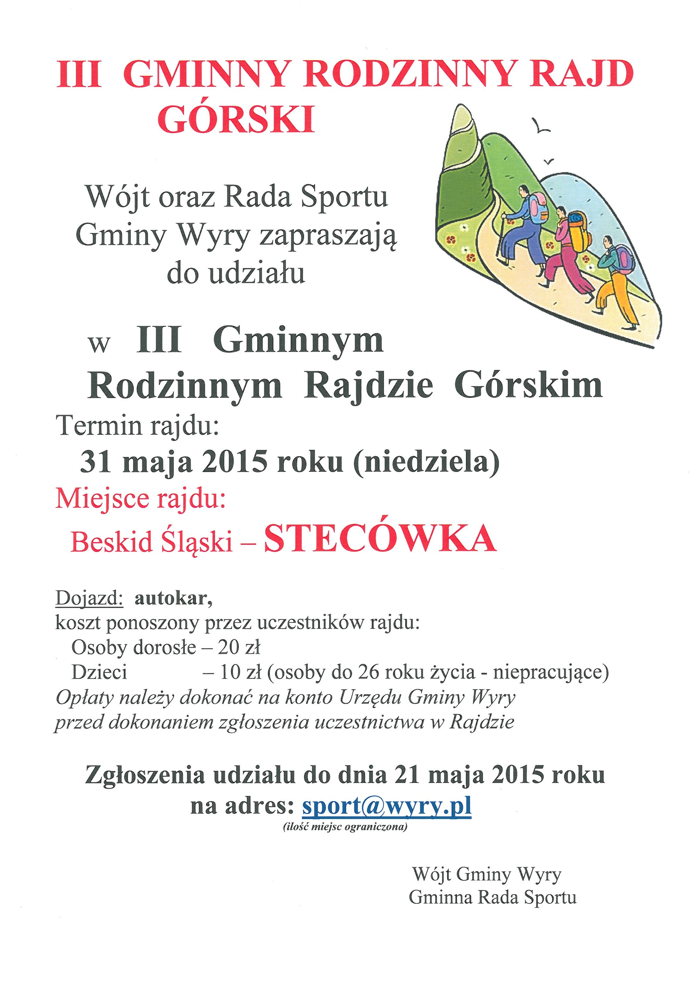 Z Regulaminem Rajdu można zapoznać się tutaj Osoba do kontaktu w Urzędzie Gminy Wyry - Zofia Syta tel. 32 325 68 12 powrót