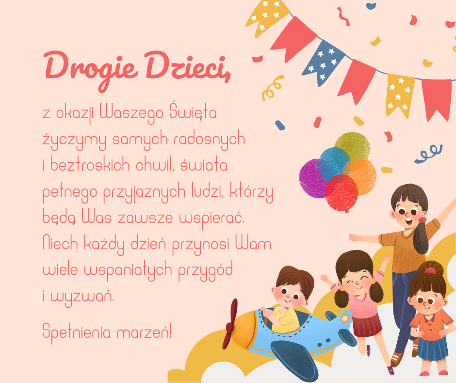 z okazji Dnia Dziecka życzę Wam pogody ducha i promiennych uśmiechów, samych radosnych i beztroskich chwil, świata pełnego przyjaznych ludzi, którzy będą Was zawsze wspierać. Niech każdy dzień przynosi wiele wspaniałych przygód i wyzwań. Spełnienia marzeń!