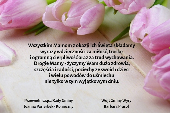 Najserdeczniejsze życzenia z okazji Dnia Matki wszystkim Mamom składa Przewodnicząca Rady Gminy Wyry Joanna Pasierbek - Konieczny oraz Wójt Gminy Wyry Barbara Prasoł Życzenia.jpeg powrót
