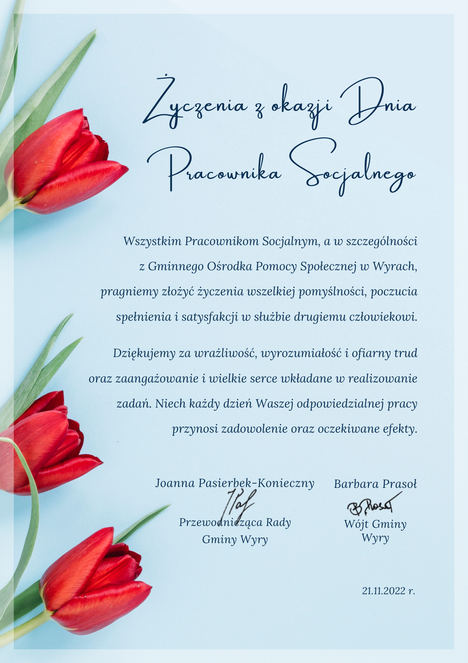 Wszystkim Pracownikom Socjalnym, a w szczególności Gminnego Ośrodka Pomocy Społecznej w Wyrach, pragniemy złożyć życzenia wszelkiej pomyślności, poczucia spełnienia i satysfakcji w służbie drugiemu człowiekowi. Dziękujemy za wrażliwość, wyrozumiałość i ofiarny trud oraz zaangażowanie i wielkie serce wkładane w realizowanie zadań. Niech każdy dzień Waszej odpowiedzialnej pracy przynosi zadowolenie oraz oczekiwane efekty.