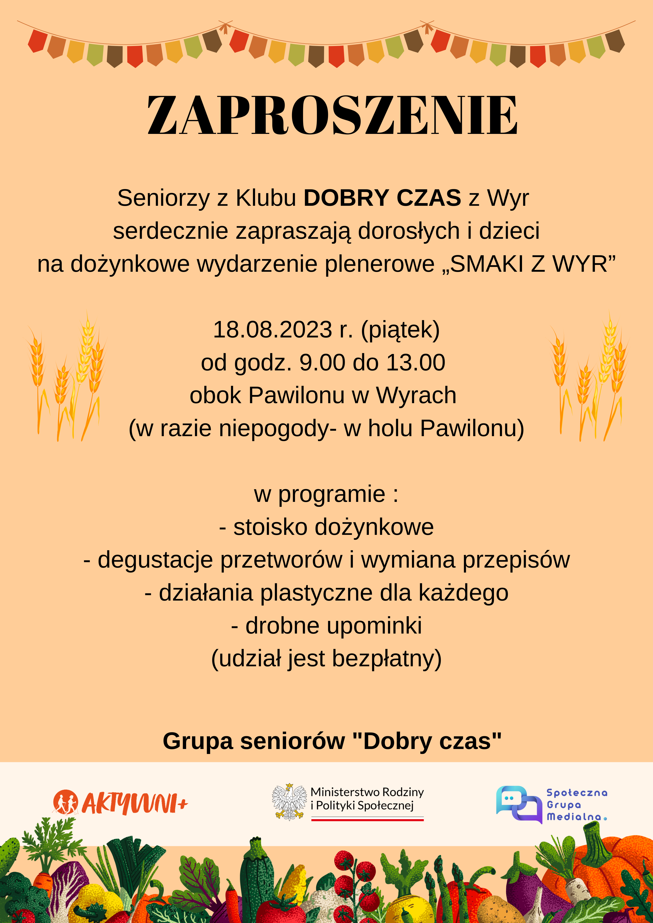 Seniorzy z Klubu DOBRY CZAS z Wyr serdecznie zapraszają dorosłych i dzieci w piątek, 18 sierpnia w godz. 9.00-13.00 na dożynkowe wydarzenie plenerowe „SMAKI Z WYR”.