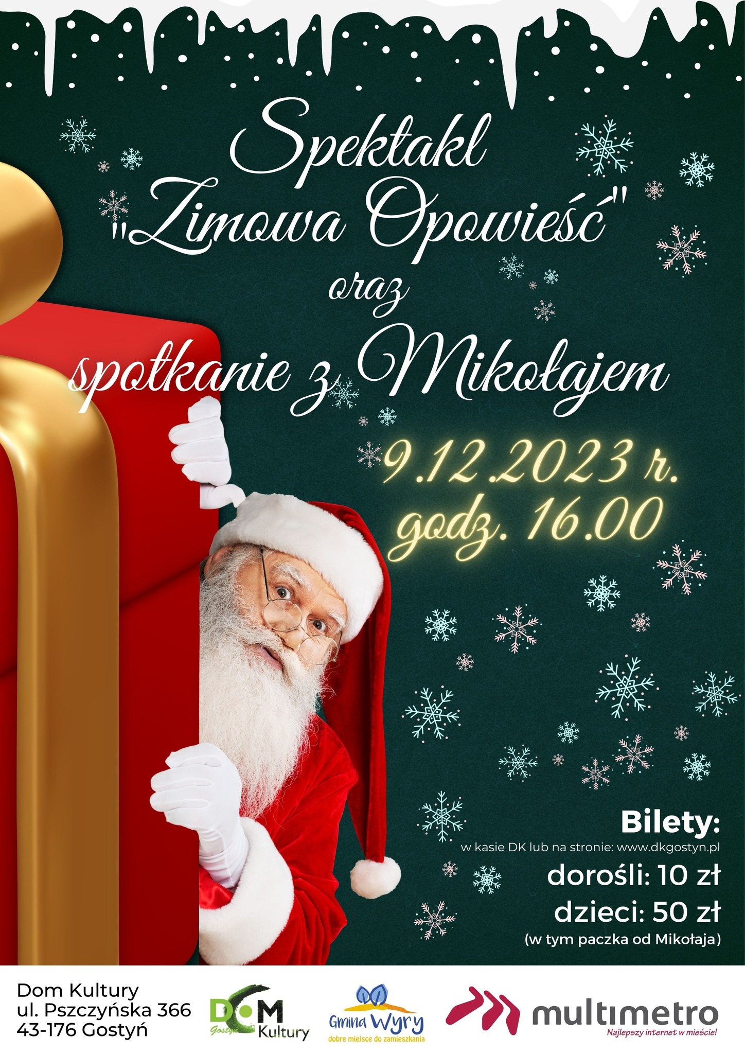 Bilety na przedstawienie Zimowa opowieść wraz z wręczeniem prezentu przez Mikołaja można zakupić w kasie D domu kultury oraz na stronie internetowej: Mikołaj 2023 bilet dla dzieci (dkgostyn.pl) / Mikołaj 2023 – bilet dla dorosłych (dkgostyn.pl).