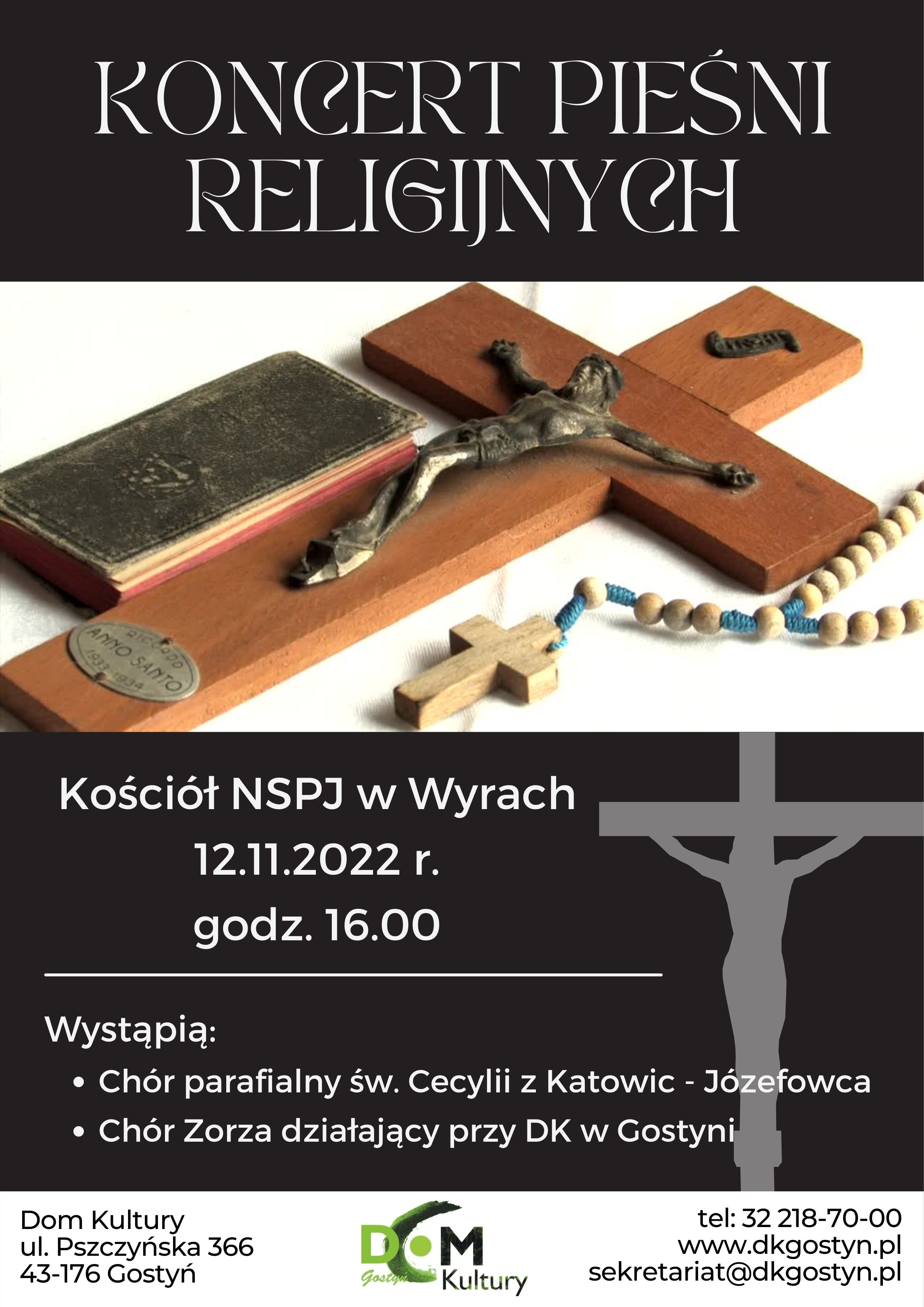 12 listopada odbędzie się koncert pieśni religijnych w wykonaniu działającego przy Domu Kultury w Gostyni Chóru Zorza oraz Chóru św. Cecylii z Katowic - Józefowca. Serdecznie zapraszamy. Miejsce: kościół NSPJ w Wyrach Termin: godz. 16.00 powrót