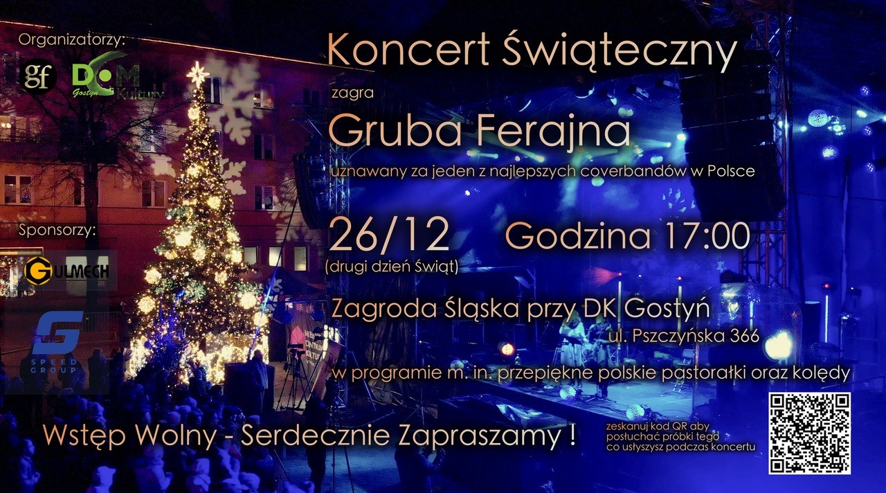 Dom Kultury w Gostyni oraz zespół Gruba Ferajna zapraszają na koncert świąteczny. Już w drugi dzień świąt, 26 grudnia o godz. 17:00 w Zagrodzie Śląskiej w Gostyni. Wstęp wolny.