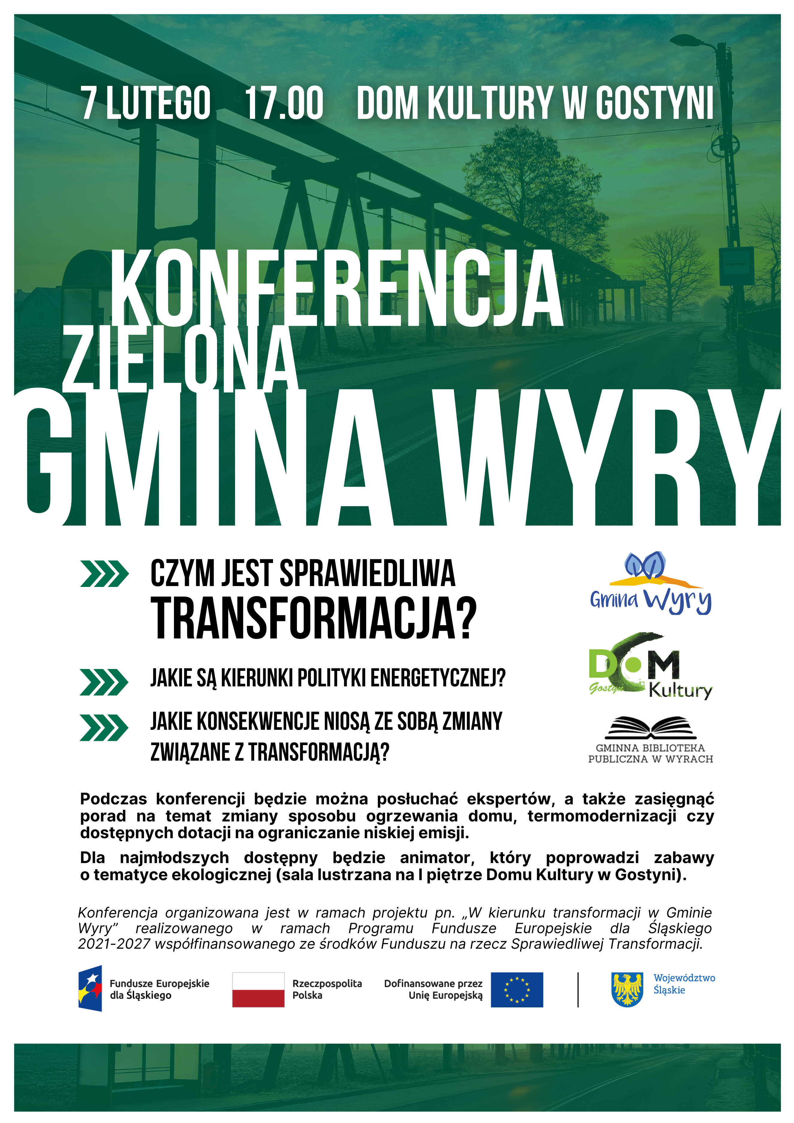 Konferencja organizowana jest w ramach projektu pn. „W kierunku transformacji w Gminie Wyry” realizowanego w ramach Programu Fundusze Europejskie dla Śląskiego 2021-2027 współfinansowanego ze środków Funduszu na rzecz Sprawiedliwej Transformacji.