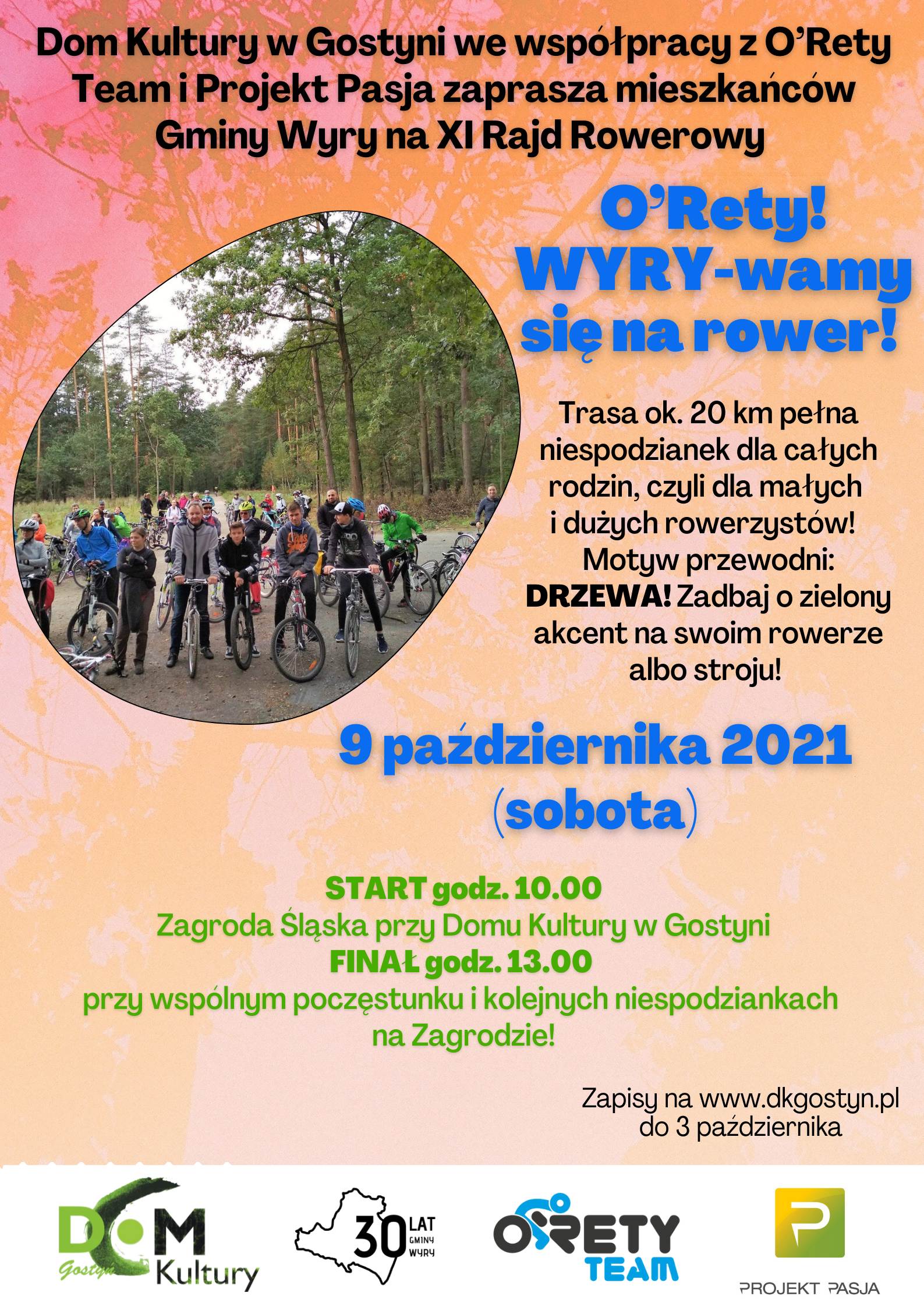 Dom Kultury w Gostyni we współpracy z O’Rety Team i Projekt Pasja zaprasza mieszkańców Gminy Wyry na XI Rajd Rowerowy O’Rety! WYRY-wamy się na rower!