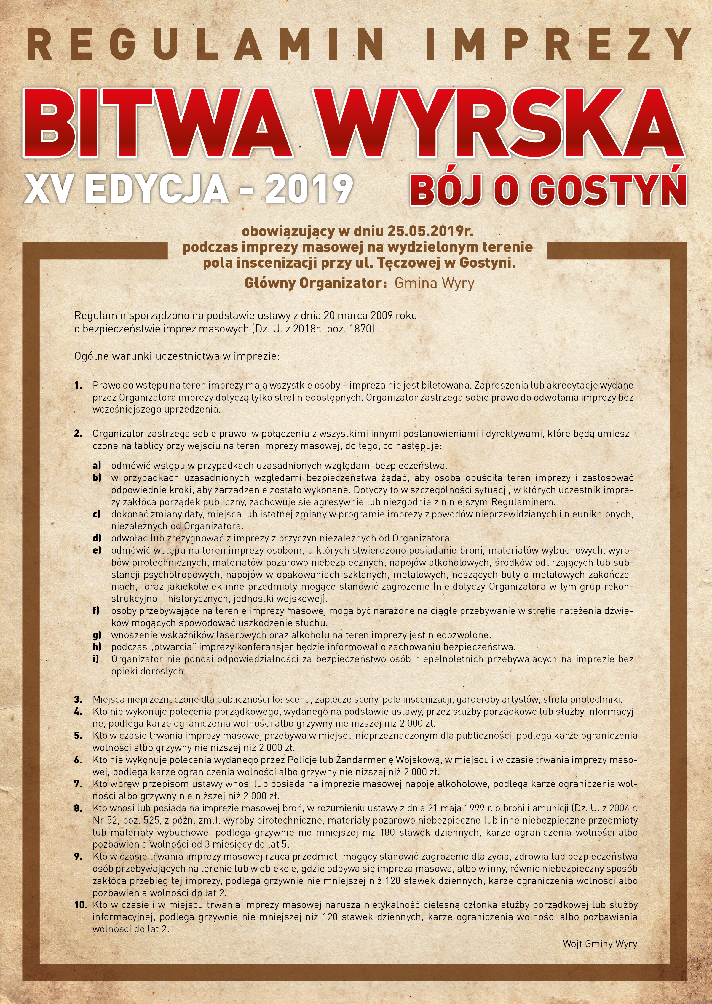 Ze względu na bezpieczeństwo podczas przebiegu inscenizacji „Bitwy Wyrskiej- Bój o Gostyń 2019 r." obowiązuje zakaz poruszania się po polu „bitwy" za wyjątkiem terenu inscenizacji o szerokości 5 metrów od płotków zaporowych otaczających miejsce inscenizacji.