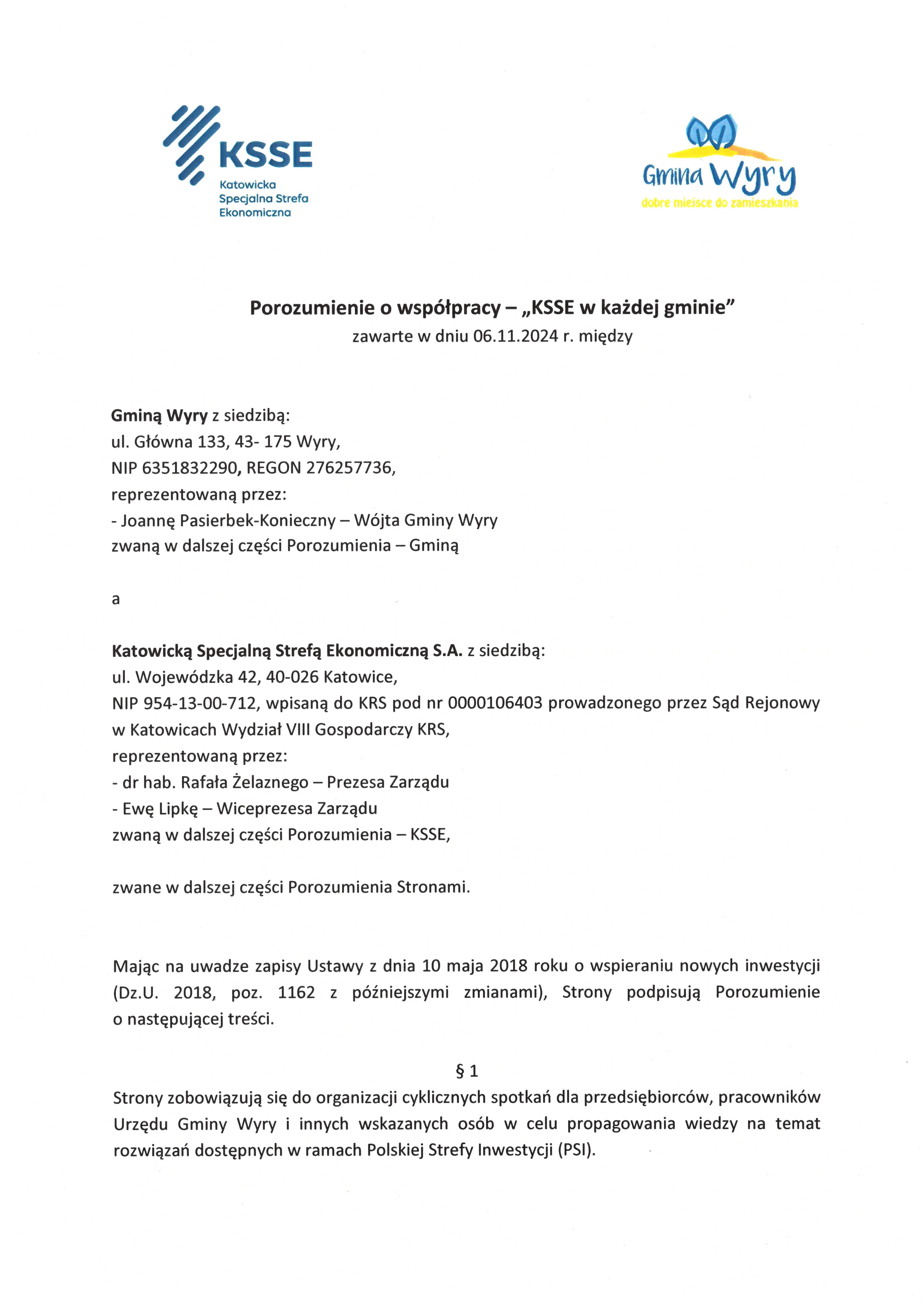 Porozumienie zakłada organizację cyklicznych spotkań dla przedsiębiorców i pracowników Urzędu Gminy Wyry w celu propagowania wiedzy na temat rozwiązań dostępnych w ramach Polskiej Strefy Inwestycji (PSI), współpracę w zakresie pozyskania inwestorów krajowych i zagranicznych zainteresowanych nabyciem obszarów inwestycyjnych na terenie Gminy Wyry będących własnością prywatnych właścicieli, a także współpracę w zakresie projektów edukacyjnych, zarówno już realizowanych przez KSSE, jak i nowych inicjatyw.