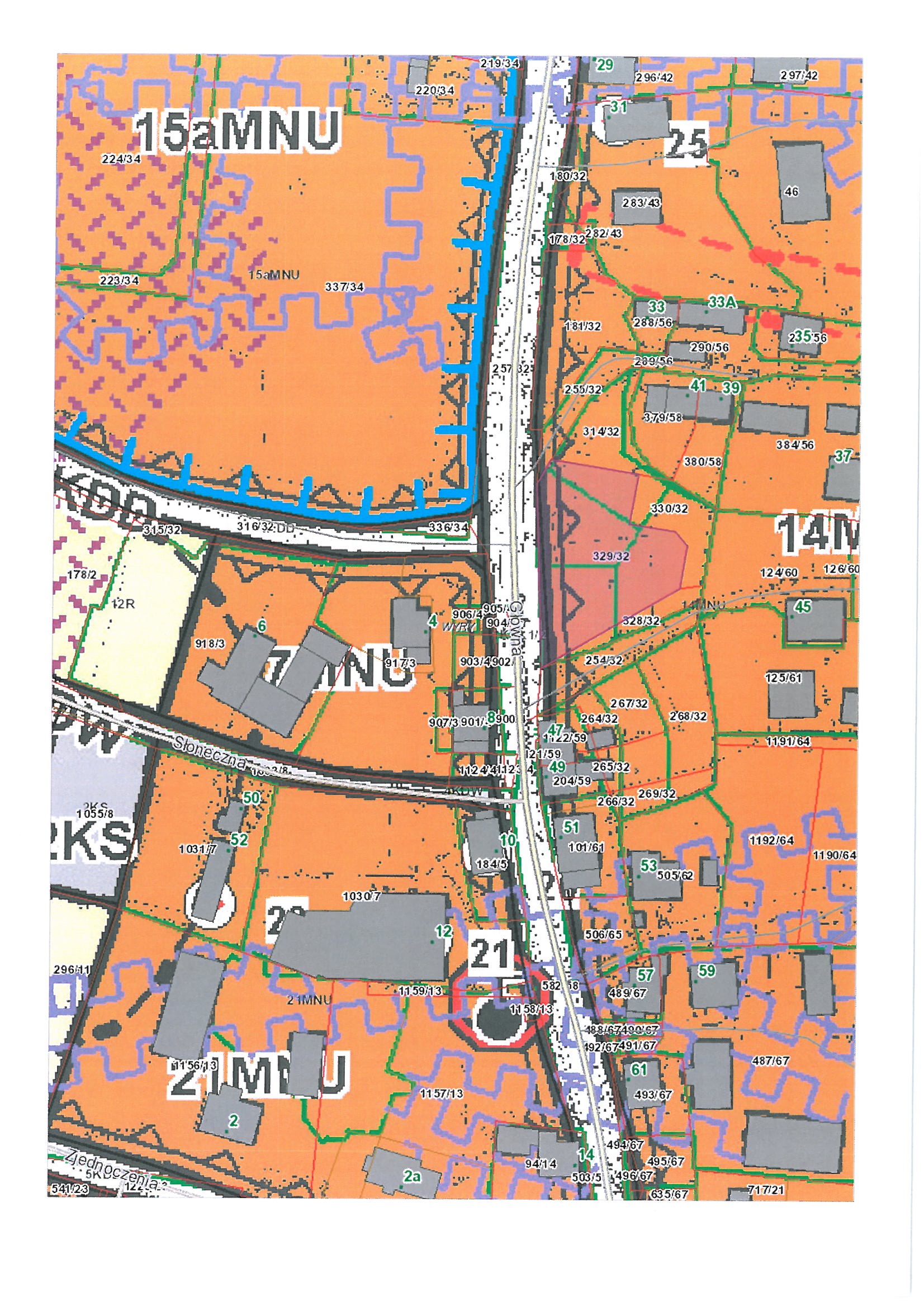 4. Zgodnie z miejscowym planem zagospodarowania przestrzennego miejscowości Wyry zatwierdzonym Uchwałą Nr XLI/405/2010 Rady Gminy Wyry z dnia 20.01.2010 r. i ogłoszonym w Dzienniku Urzędowym Województwa Śląskiego Dz. U. W. Śl. z 2010 r. Nr 43, poz. 663 przeznaczeniem podstawowym terenu, oznaczonego na rysunku planu symbolem 14MNU jest teren zabudowy mieszkaniowej jednorodzinnej z towarzyszącymi usługami. Przeznaczenie dopuszczalne terenu obejmuje zabudowę mieszkaniową wielorodzinną do czterech mieszkań w budynku, zabudowę zagrodową, zabudowę zamieszkania zbiorowego, zabudowę usługową, nieuciążliwe działalności usługowo-wytwórcze, obiekty i budynki gospodarcze, garaże, miejsca postojowe, wewnętrzną obsługę komunikacyjną, sieci i urządzenia infrastruktury technicznej, za wyjątkiem masztów telefonii komórkowej. Część działki 329/32 przeznaczona jest w miejscowym planie, jako symbol 1KDL1/2 -teren komunikacji dróg publicznych klasy lokalnej.